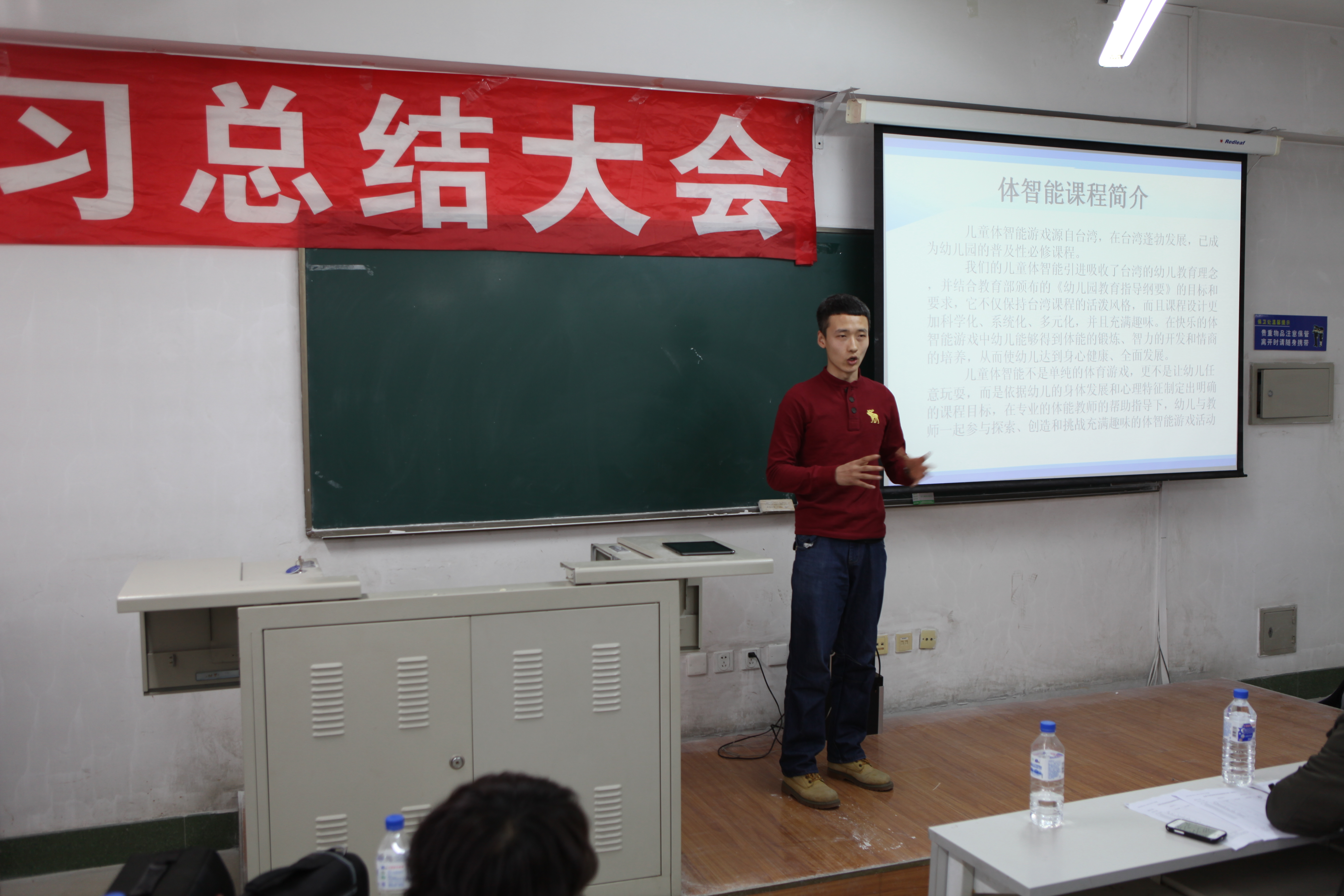 郭玉莲老师担任本次会议的主持人,一番意味深长的开场话语结束后,实习总结大会拉开了帷幕。大会第一项,副院长邹晓峰针对大四实习情况进行了详细的发言。在发言中,邹院长针对我院实习生在实习学校的表现提出了充分的表扬,给予了很高肯定。同时,也为我们分析了当下就业形势的严峻,鼓励我院实习生继续努力,求实创新,励志图强,争取找到一份理想的工作。大会第二项,由每个实习学校为一组,带队老师先发言,然后学生代表发言。本次在实习工作中一共设立了8个实习单位,它们分别是:师大附中、吉大附中、长春市第11高中、长春市第十七中学、长春市一汽六中、英派斯俱乐部、一汽幼儿园、北京师范大学附属中学。其中长春市一汽实验幼儿园,深圳市北京师范附属中学为新建实习单位。通过带队老师的发言我们了解到,我院的学生在逐步的成长,越来越趋近成熟,每一名带队老师发言的时候,脸上都带着难以掩盖的喜悦与骄傲。学生代表们更是精心准备了展示他们实习风采的PPT和难以言尽的实习感触。每名实习生在台上展示的时候,我们看到他们不仅仅是在教学理论与教学方法上有所进步,更为重要的是他们在做人,做事上的能力有着大幅度的提高,这点是让我们每个人为之欣慰的。大会第三项,与会的实习生自由发言,师大附中实习组的刘健婷同学将她在实习的两个月里所有的感触向我们倾诉,我们体会到,我院的实习生在实习的日子里过得是如此的充实与精彩。