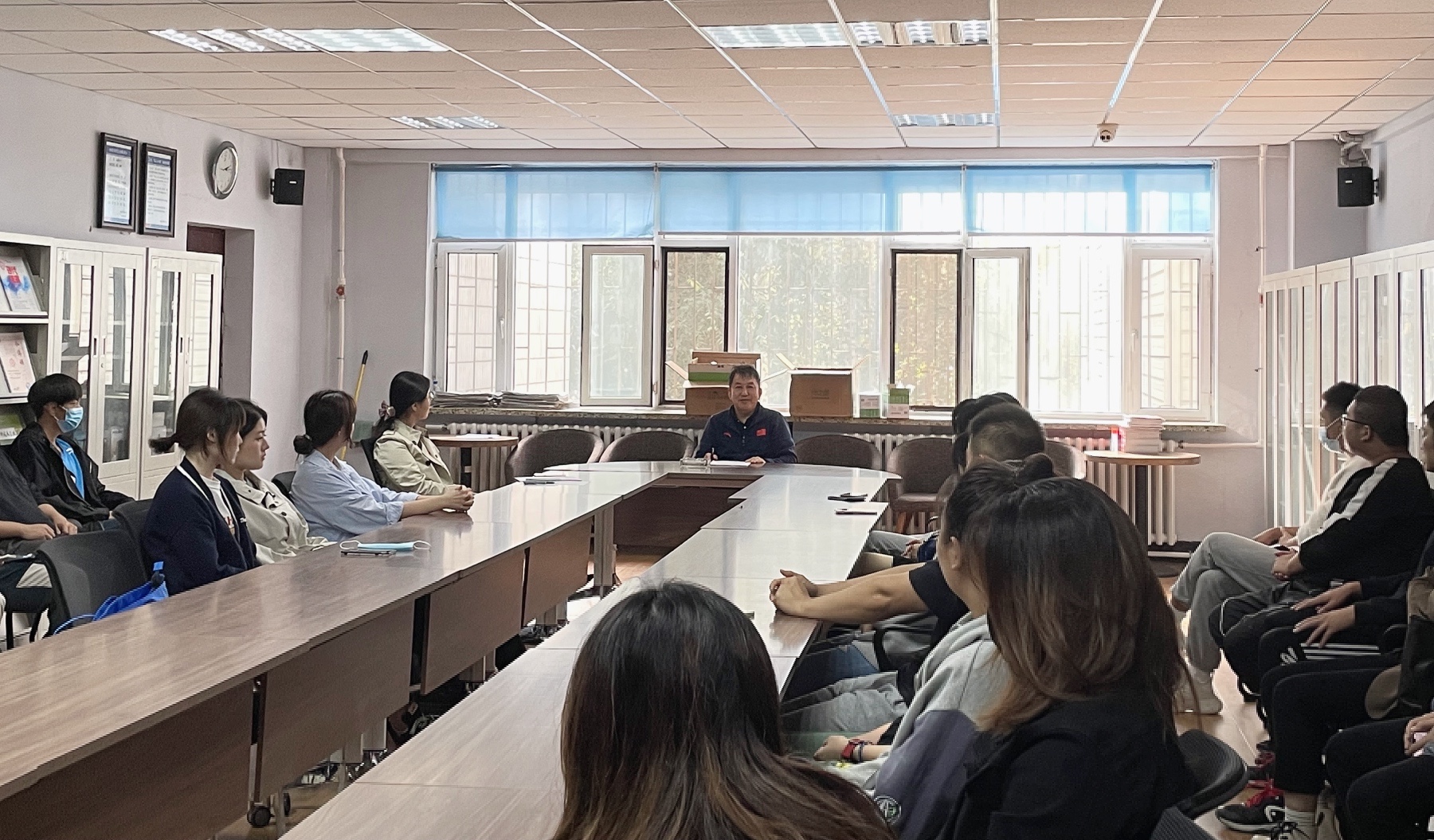 在体育馆208会议室开展2021级硕士研究生入学第一堂思政课活动,学院党委书记逄锦彩、研究生辅导员王紫萱及全体2021级硕士研究生参加此次活动。