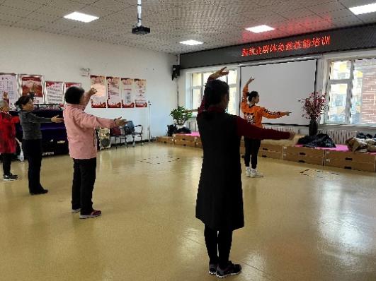 在前进街道孟家社区,体育指导队员精神饱满地指导社区老年人跳健身操。