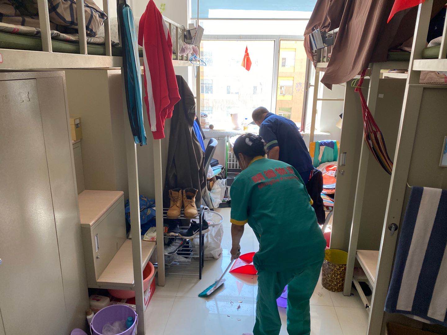 辅导员、前卫校区后勤服务中心公寓部工作人员、明德物业工作人员聚集在学生公寓门前,按照事先整理好的有诉求学生名单,逐一房间为学生晾晒被褥、清理垃圾。工作人员早已准备好名帖,分别在公寓床、被褥上做好标记,防止物品弄混、丢失。大家分工明确,擦栏杆、取被子、夹标签、晒被子、收回等一整套流程,全部由专人负责。最后,物归原位,叠得整整齐齐。