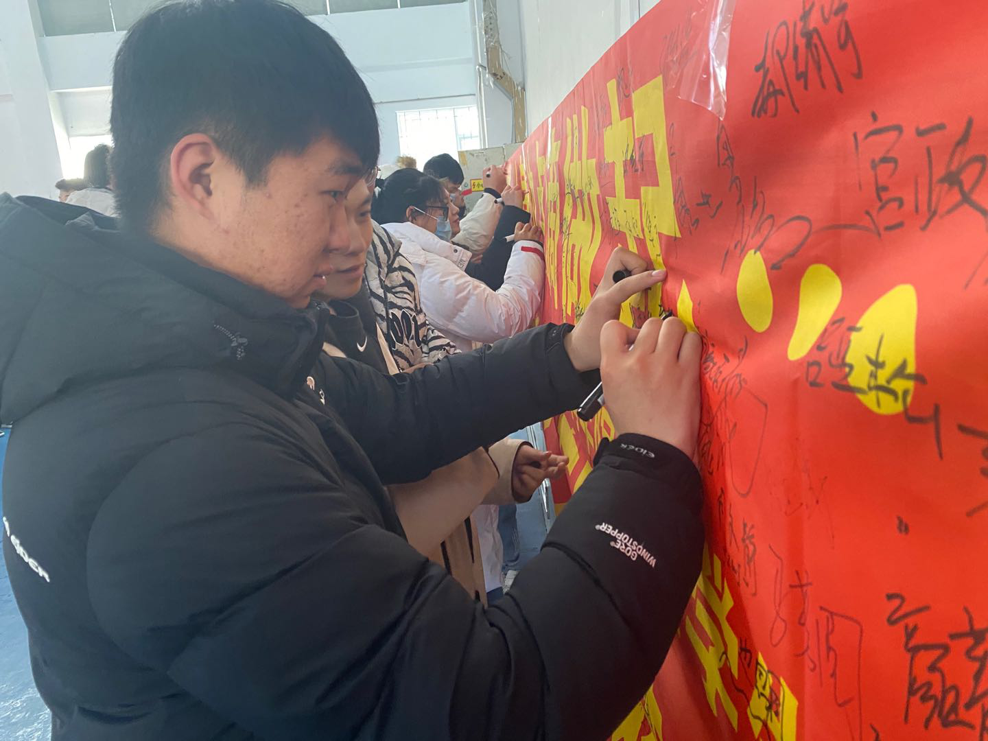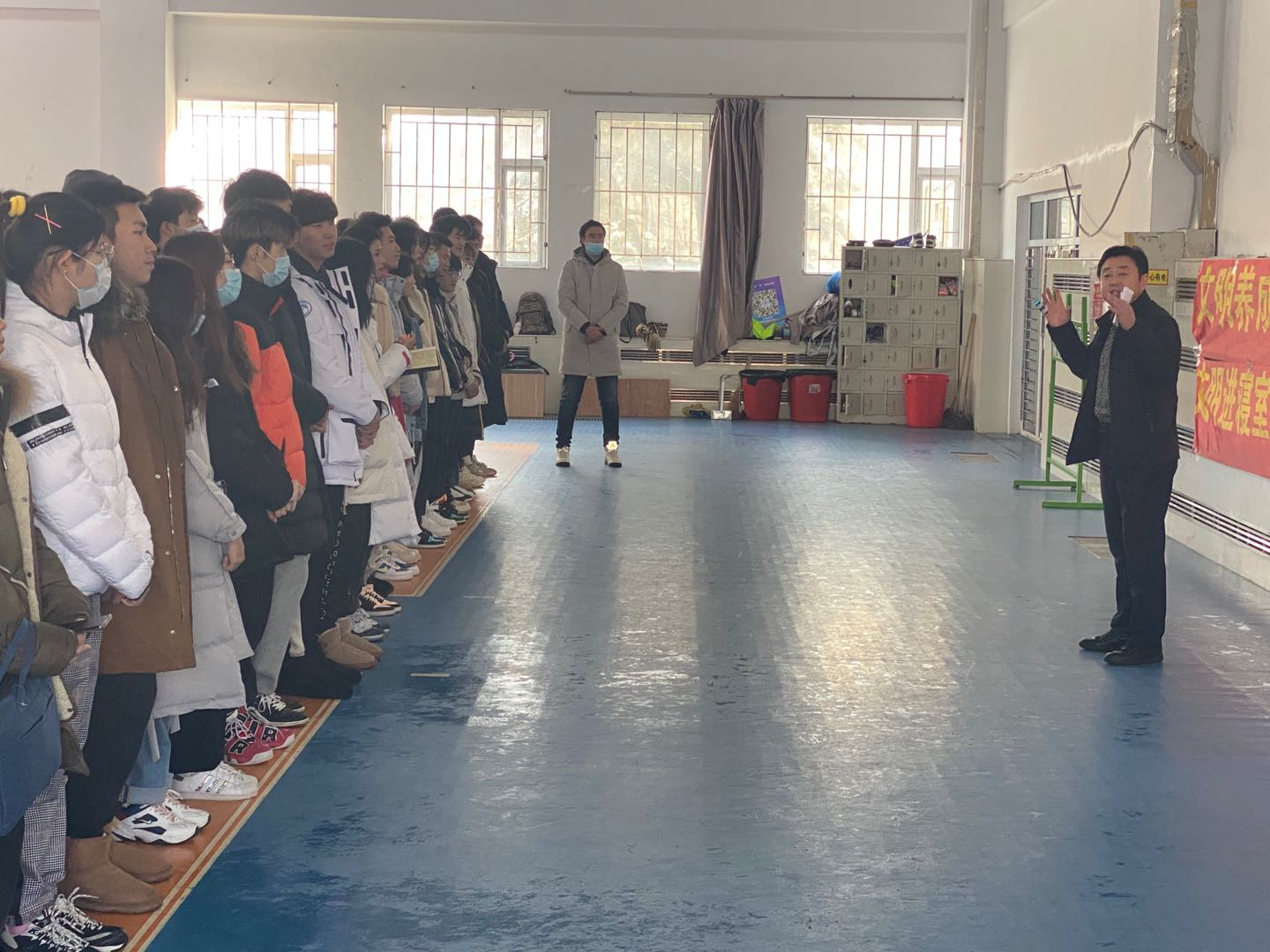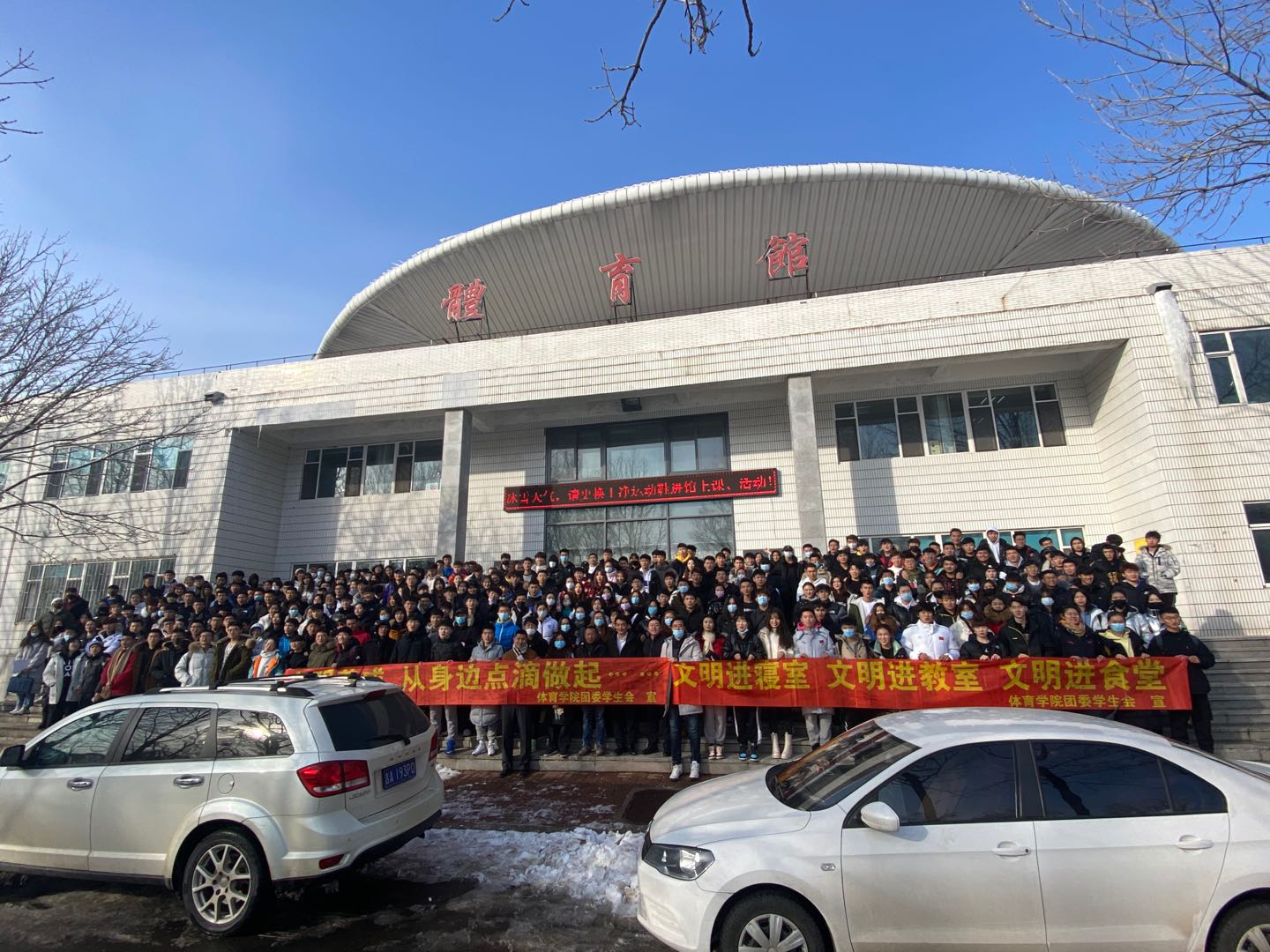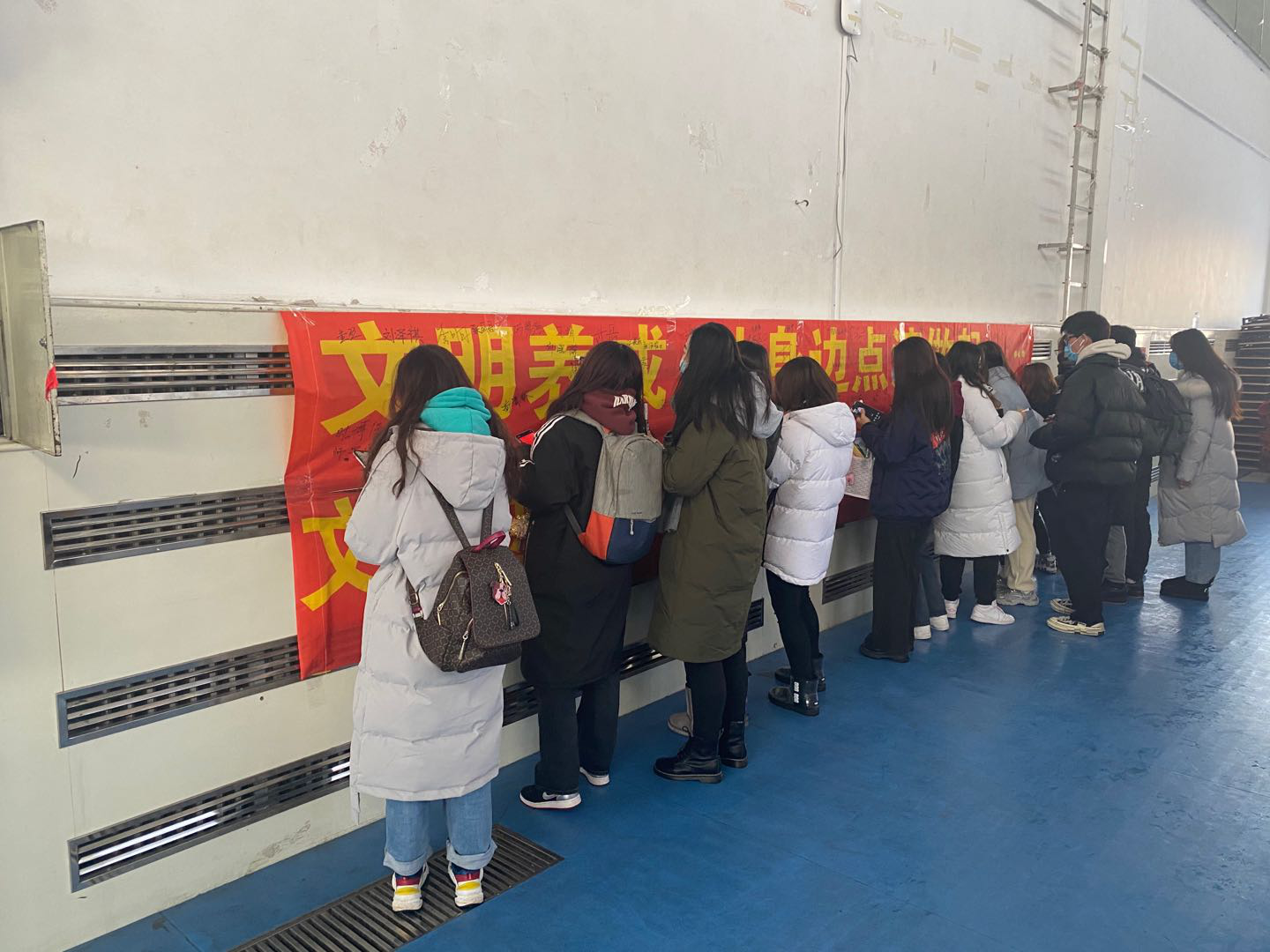 活动伊始田进副书记首先简要介绍了开展此类活动的初衷,并结合校园日常生活中存在的不文明现象,重点结合“文明进寝室、文明进教室、文明进食堂”,强调了 “为什么做,怎么做,做得怎么样” 的目的和意义。同时,田进副书记进一步强调要严格控制请销假制度重视每日健康打卡,如实上报个人情况,叮嘱学生们在校期间要注意个人形象,杜绝不雅行为,避免违规违纪,夜间按时回寝,积极配合宿管工作。期末考试临近,考风考纪要引以为重,警示学生们不要触碰“红线”,坚守诚信。随后,全体学生在宣传条幅上依次签名,以表自己对学院工作的支持,并承诺改善自己的不良行为。最后,全体师生在体育馆门前合影留念。