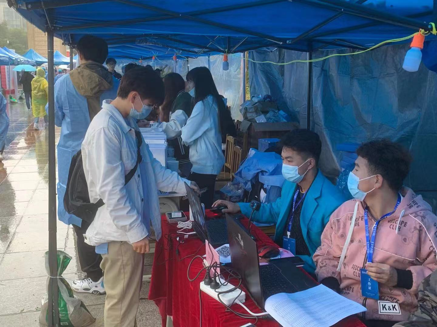 迎新志愿者在五月花报到点准时集合,佩戴口罩,穿着防护服,布置黄漫